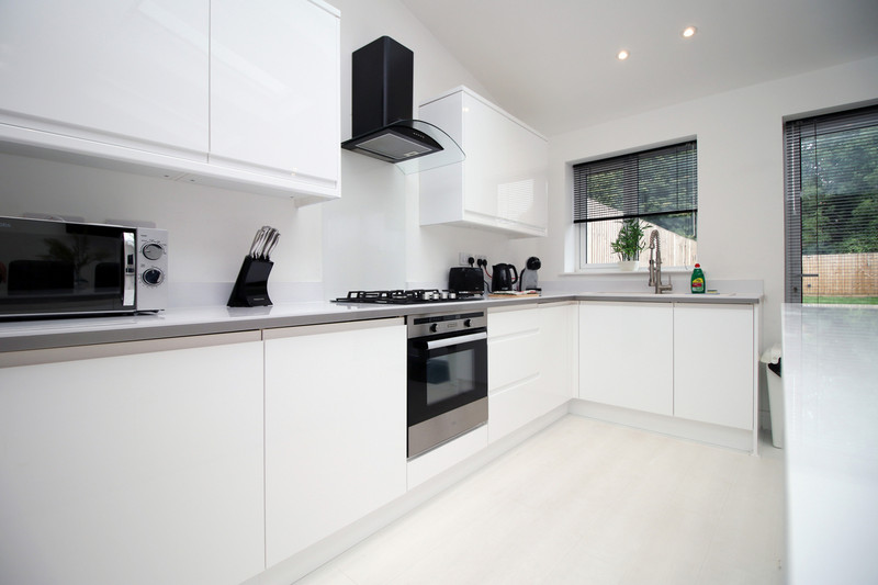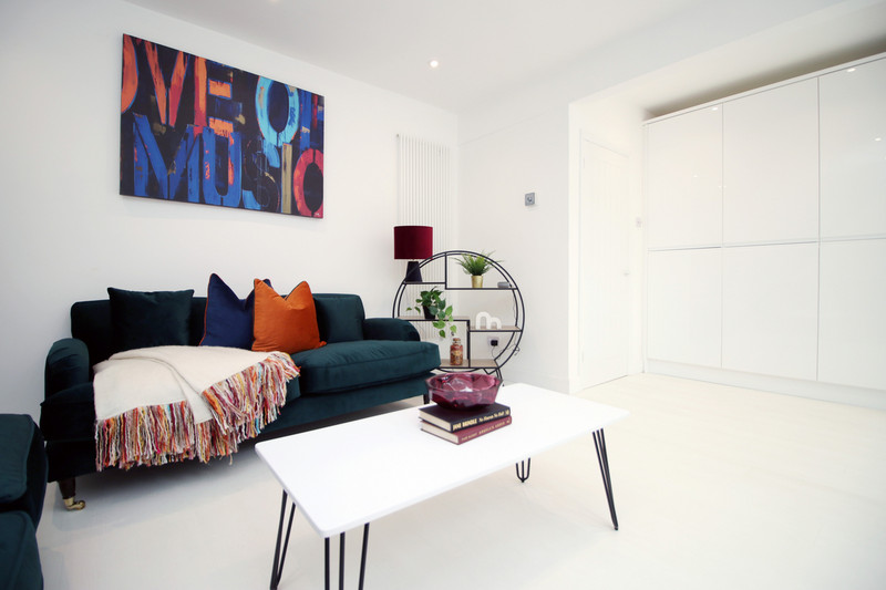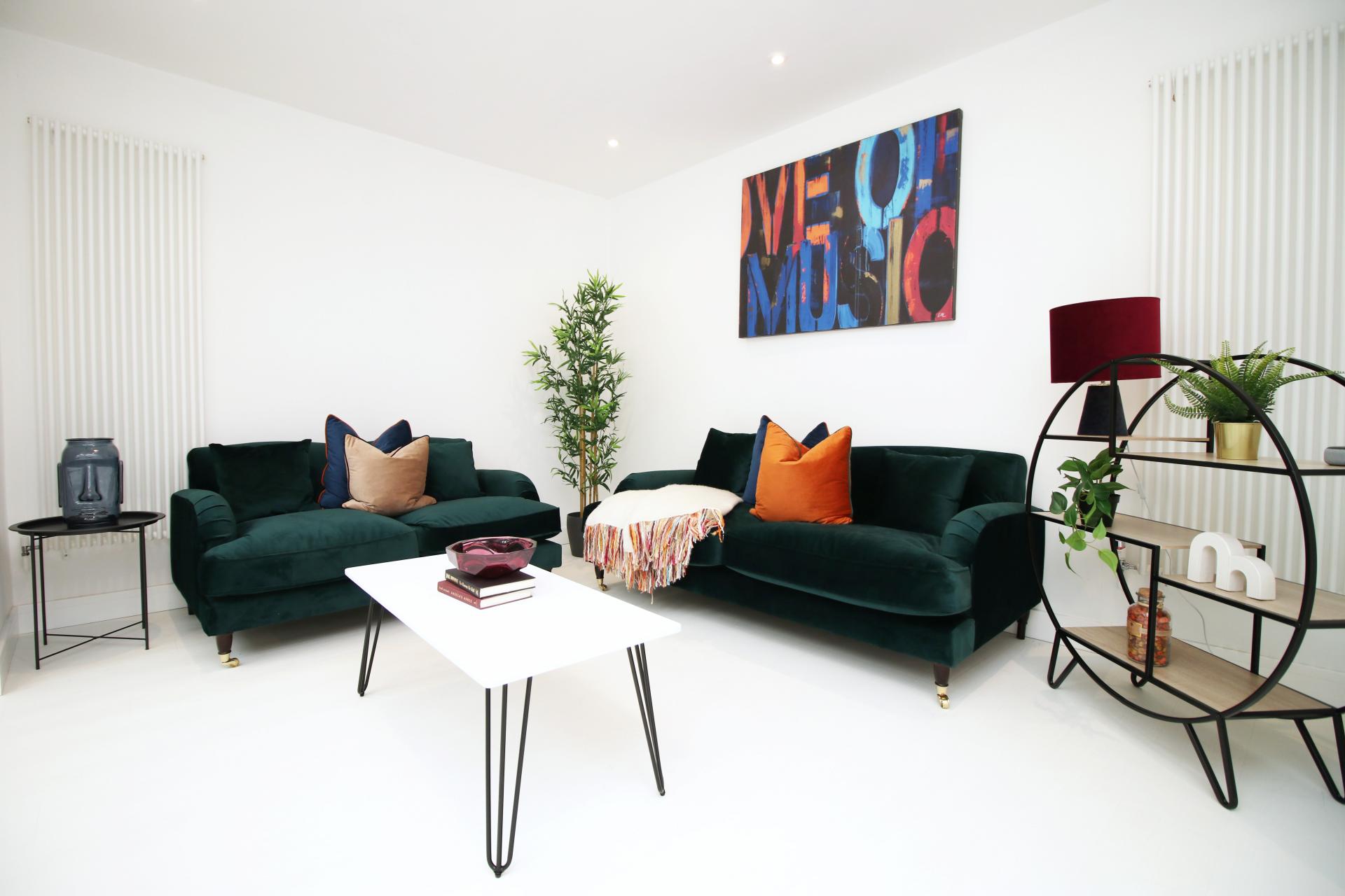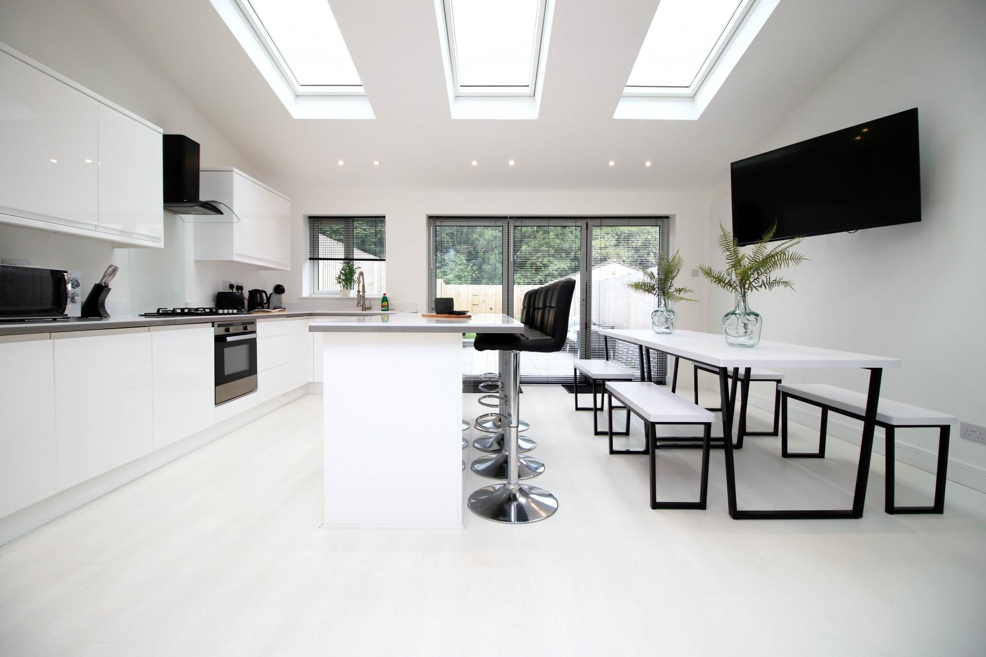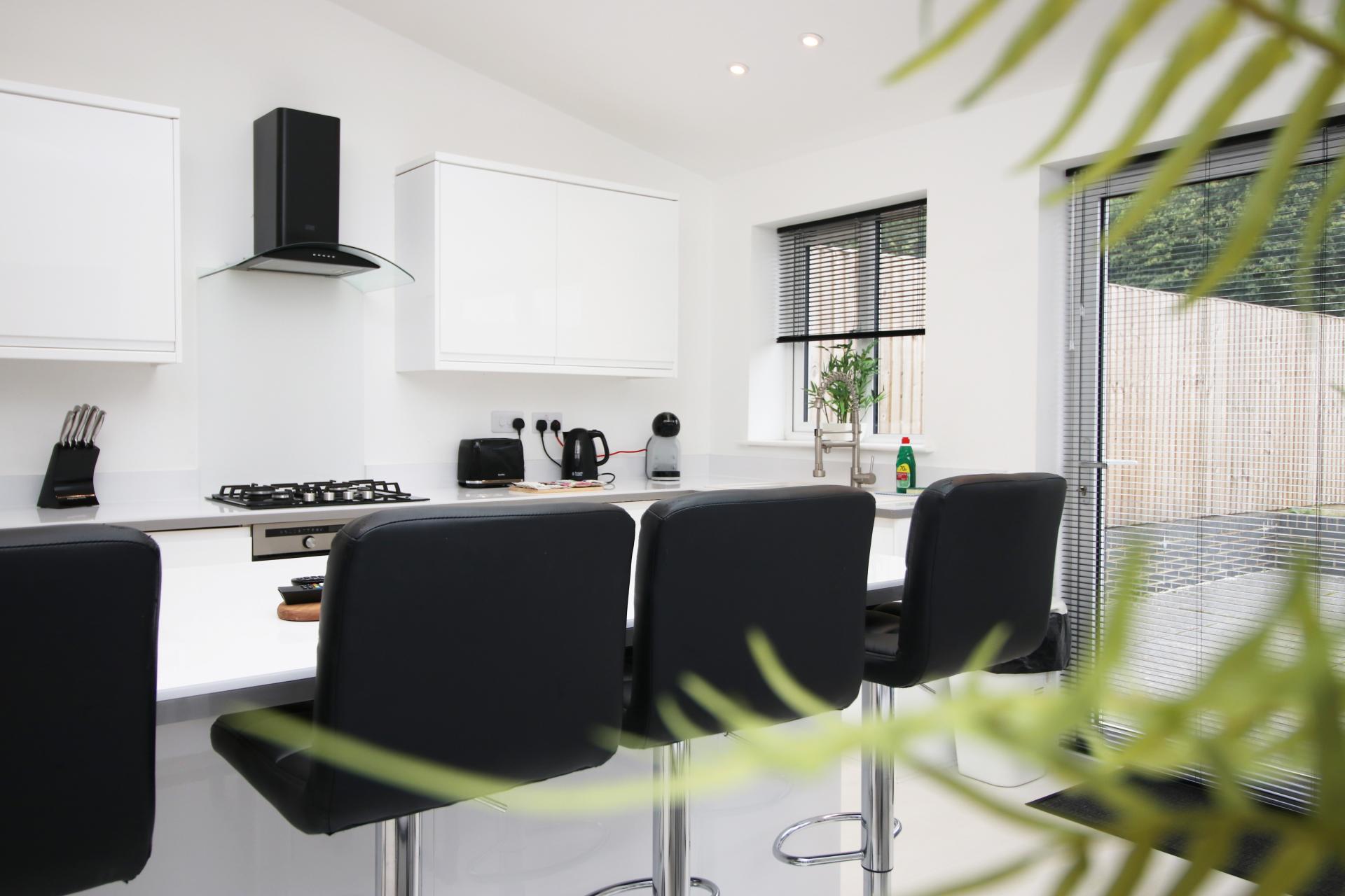 The property has a spacious open plan lounge kitchen leading to a large garden, perfect for relaxing in the evening, and catching up with friends and colleagues over dinner. The kitchen is fully equipped and includes a breakfast bar, a dishwasher, a microwave, a washing machine, a fridge freezer and an oven.